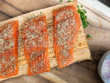- Cut salmon filet into 4 equal pieces. Place the salmon skin side down on the cedar plank. Sprinkle approx half the rub on the salmon (less on the thinner belly) and gently pat it on.