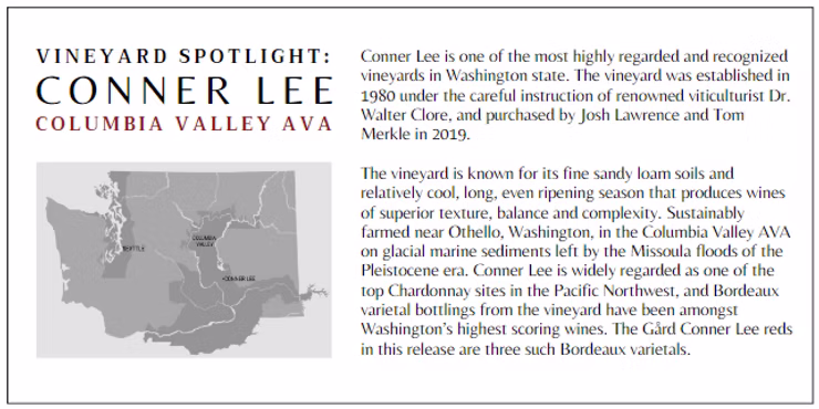In this release, we are focusing on all reds, including three NEW Conner Lee vineyard designate wines. Conner Lee is such a unique and iconic vineyard in Washington, we wanted to give this estate vineyard the tribute it’s due by highlighting three fantastic red varietals we grow sustainably at this site.