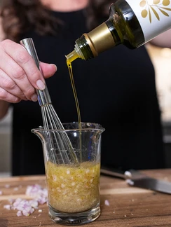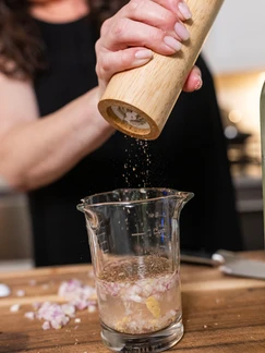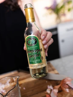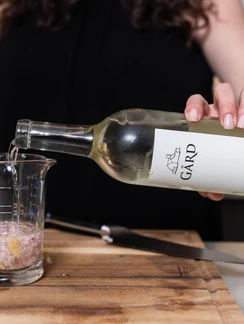- Pour champagne vinegar into a jar. Add shallot and let steep in vinegar for 10 min or so to soften the taste of the shallot.