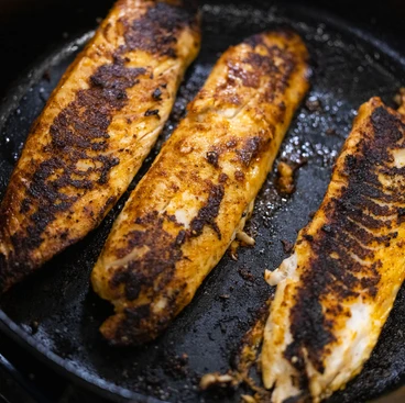 - Cook fish: Heat a cast iron or stainless skillet on med-high. While pan is heating, take fish out of fridge. Brush one side with oil and sprinkle about ½-1 tsp fish seasoning on each oiled side. Drizzle oil in pan, add fish seasoned side down. While fish cooks, brush with oil and season again with ½-1 tsp of seasoning on each piece. After 3-4 minutes, using a fish spatula, take a peak to see if the fish is lightly charred. If it releases easily, turn it over. If not, let it cook for 1-2 more minutes. Cook on the second side until cooked thru, about 3-4 minutes depending on size of fish. Flake fish and remove from pan.