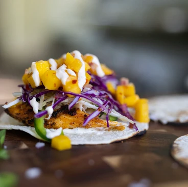 Love fish tacos? Loaded with pan-seared white fish, mango salsa, slaw and a kick a** ‘Bama white sauce, these tacos are the ultimate!