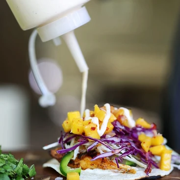 - Assemble tacos: Heat tortillas if desired (we recommend as it helps make them a little more flexible and taste better). Assemble tacos with garnishes, fish and sauce. Serve immediately and enjoy with a glass of Albariño!