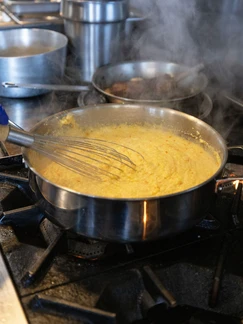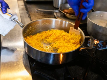 - For polenta: Heat the veggie concentrate + water + milk in a saucepan and set aside. In another pan add the olive oil, then sauté red onion and bell pepper for a few minutes until they become translucent. Add the polenta and fry it until lightly golden. Carefully pour in all the liquid at once, then whisk continuously to prevent lumps. Cook the polenta until it becomes creamy and fully cooked, about 5 minutes. Once ready, stir in the parmesan and the mozzarella cheese. Adjust seasoning to taste. Keep warm.