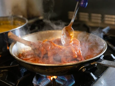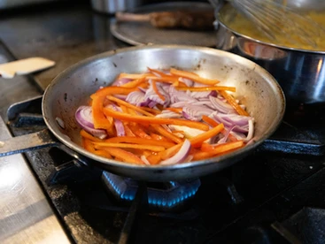 - For the sauce: In a hot pan with a little olive oil, sauté the bell pepper and the onion for a short time until they become translucent. Season with salt, pepper, and brown sugar, then cook for another minute. Deglaze with red wine vinegar and let it evaporate for a moment. Add the tomato sauce and a bit of minced garlic. Let it cook briefly until all the flavors come together. Adjust the texture of the sauce by adding a little water if needed – it should not be too thick. Finally, place the pork chop in the sauce letting it absorb the flavors before serving.