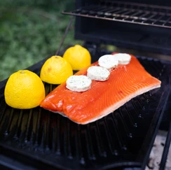 - Rinse and remove pin bones from the salmon. Sprinkle salt liberally over salmon and leave on for 20-30 min. Lightly rinse the salmon, pat dry, and place on a sheet pan. Salt salmon with ~½ tsp garlic salt. Slice the butter into 4-5 rounds and place on top of salmon. Slice lemons in half to grill.