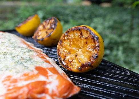- Preheat oven or BBQ and a cast iron grill to 400°. Once it’s to temp, put the lemons and then the salmon, skin side down, directly on the cast iron pan. Cook for approx 10 min, depending on the size of your salmon, until the internal temp is 145°. If you prefer a more moist and flaky texture or if you’re cooking wild salmon, a lower temp of 120-125° is recommended by many chefs.