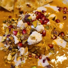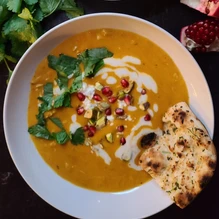 - To serve, ladle soup into bowl. Drizzle coconut ginger cream over the top. Garnish with chopped cilantro, chopped pistachios and crumbled goat cheese. Sprinkle with pomegranate arils. Serve with a hot piece of naan, pita or over rice with a glass of chilled Sémillon or Riesling!