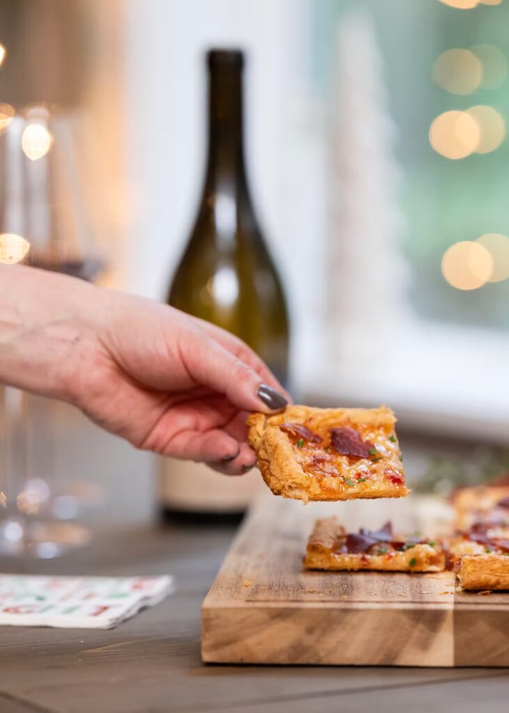 Frozen puff pastry is rolled out and par baked, then layered with sweet pepper jelly, thinly sliced brie and grated Gruyere, baked again, then topped with crispy prosciutto. Sigh, mmmm. AND, you can brighten it up with some fresh herbs and pomegranate arils if you like. (Yes, we know the pomegranate seeds are not in the photo, we forgot, ok? It’s the holidays…there’s a lot going on! Can we just pretend they’re on there? See how pretty that looks? Stunning! LOL.)
