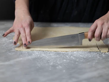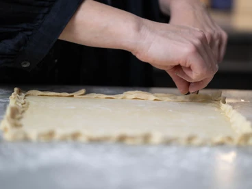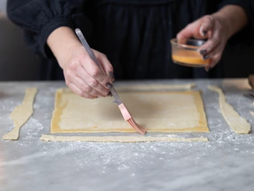 - Cut off the edges of the pastry with a knife or pizza cutter about ½ inch thick (some will be more, some will be less because it likely won’t roll out to a nice, even square). Gently move them an inch or two away from each side. Brush the whisked egg around the perimeter creating about a one inch border. Then pick up the strips and lay them on top of the egg wash “glue”. This will make a border when the pastry puffs up. Pinch all sides together to seal them. As an added touch, crimp with your fingers to make a wavy edge like a pie crust. With the aid of a bench scraper or large spatula, gently loosen the pastry and carefully lift it onto a sheet pan. Dock it with a fork (poke holes all over to help keep the center from puffing up too much). Par bake the dough for 10 min.