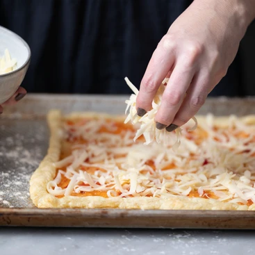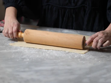 - Place thawed puff pastry on a lightly floured surface. Carefully “open up” the dough. Dust your rolling pin with flour and gently roll out the dough, checking often to be sure it doesn’t stick. If you need to, toss a little flour underneath the dough and continue to roll out until about ⅛ inch thick.