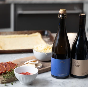 - Serve warm, if possible (it warms nicely in the microwave for a few seconds and the crust stays crispy) with a glass of 2022 Sans Soufre Mourvedre and 2021 Skal Sparkling Rosé. Enjoy!