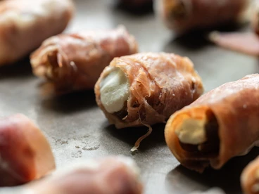 - Once the hour is up, roll or stuff cheese into date halves. Cut prosciutto slices in half lengthwise into 2 pieces. Roll each date up in a half slice of prosciutto and place on a tin foil lined baking sheet.