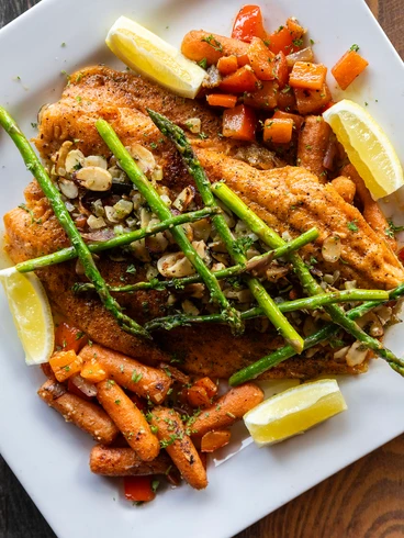 - To finish plating: Arrange the vegetables on the sides and place the trout in the center. Generously spoon the almond sauce over the trout.