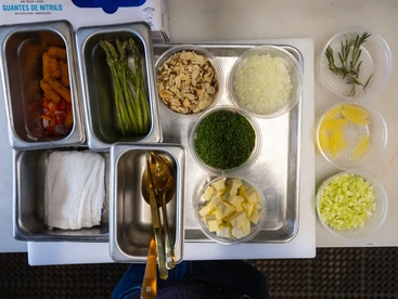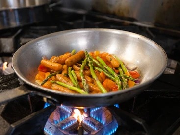 - For the veggies: Heat olive oil in the same pan on high until it reaches the smoking point to achieve a nice caramelization. Add the vegetables and cook for about a minute. Add garlic, then immediately deglaze with white wine. Once most of the wine has evaporated, add a bit of butter and season with salt and pepper.