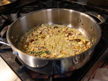 - For the sauce: In the same pan, cook the onion and celery in butter for a couple minutes. Add fresh rosemary, toasted almonds and lemon segments. Adjust seasoning to taste.