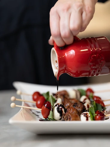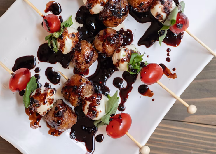 Sausage Bite & Caprese Skewers with Balsamic Drizzle