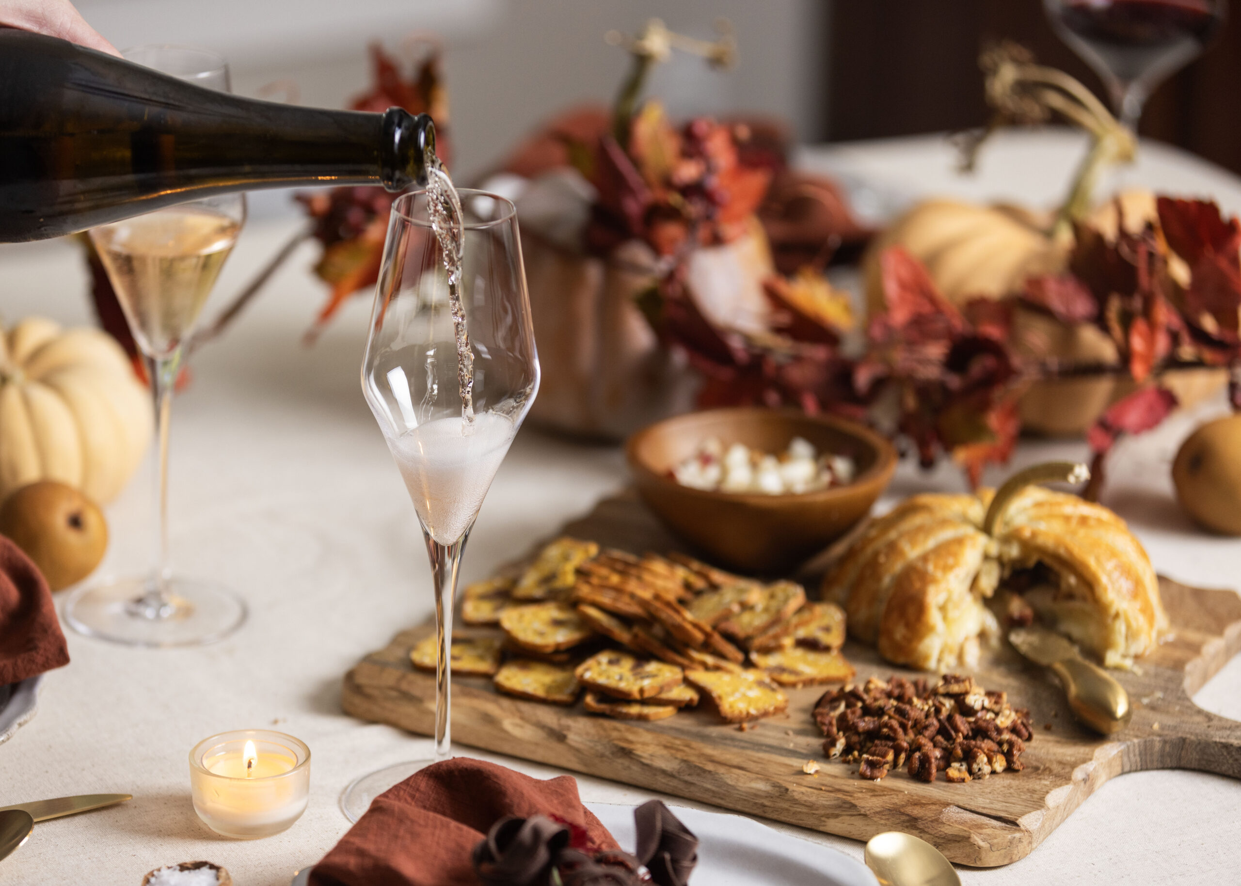 This festive baked brie is a showstopper – whether served as a cozy appetizer with Skål Sparkling Rosé or a decadent dessert alongside a glass of Ice Wine. Wrapped in golden puff pastry and shaped like a pumpkin, it’s filled with warm spiced pears, and melted brie, then topped with fresh pears and sweet and spicy pecans. A perfect appetizer for Thanksgiving gatherings!