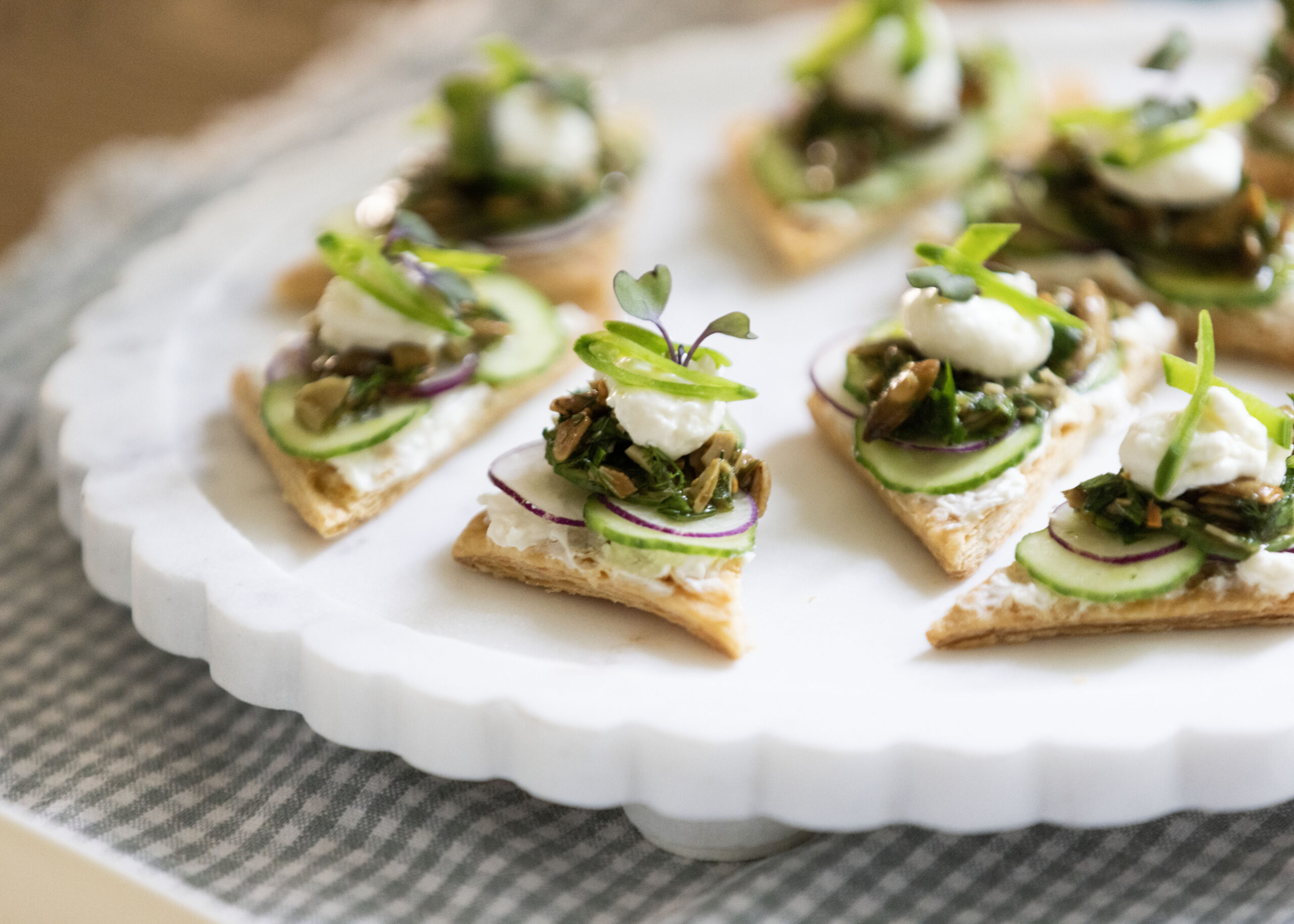Snip the corner of the feta bag and pipe a small amount onto each cooled pastry triangle. Smooth with an offset spatula. Alternate slices of cucumber and radish on each tartlet — as much or as little as you like. Spoon or spread a little gremolata over the veggies. Top with a small dollop of whipped feta and a few sliced snow peas. - Finish + serve