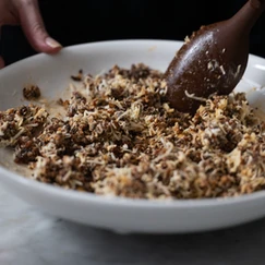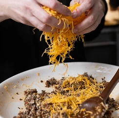- Once the meat mixture has cooled a bit, add the cream cheese and mix thoroughly. Then add the shredded cheese and mix gently until combined.