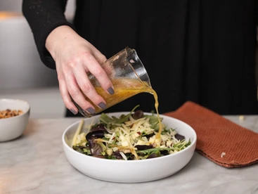 - Make the salad: In a salad bowl combine ingredients except the hazelnuts and bacon. When you are ready to serve, dress the salad with the nuts and bacon. Shake the dressing and drizzle on desired amount. Toss to combine and serve immediately.